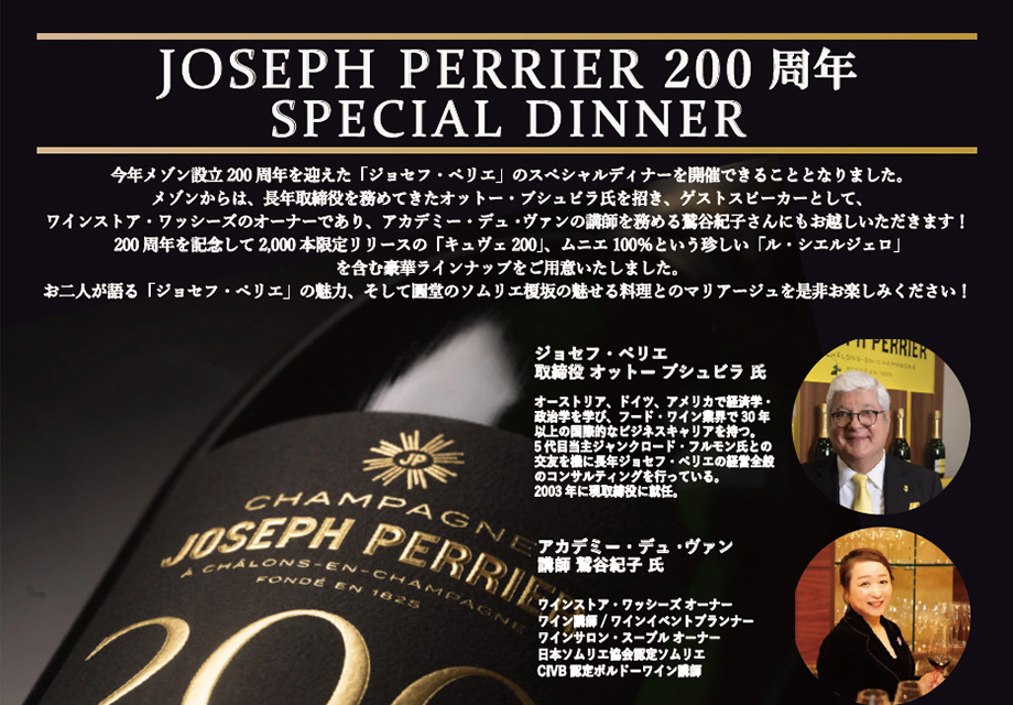 今年メゾン設立200 周年を迎えた「ジョセフ・ペリエ」のスペシャルディナーを開催できることとなりました。